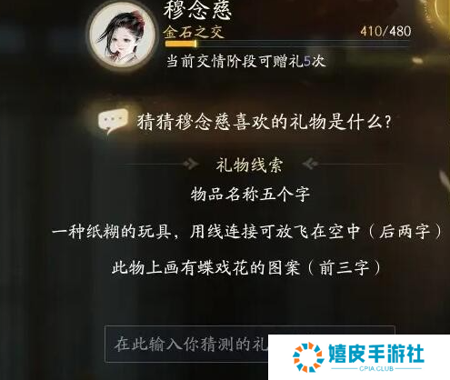 礼物线索一:物品名称五个字,一种纸糊的玩具,用线连接可放飞在空中(后两字),此物上画有蝶戏花的图案 (前三字)