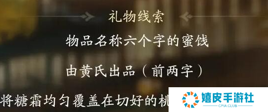 礼物线索七:物品名称六个字的蜜饯,由黄氏出品(前两字),将糖霜均匀覆盖在切好的桃条上(后四字