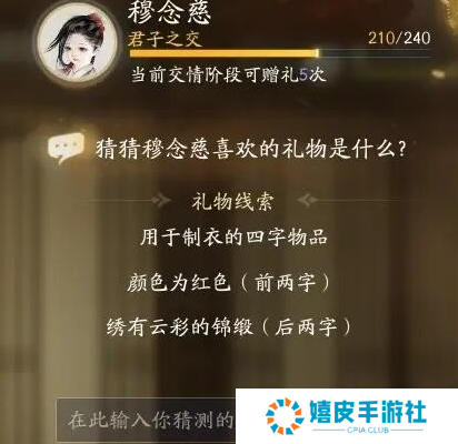 礼物线索十:用于制衣的四字物品,颜色为红色(前两字),绣有云彩的锦缎(后两字)