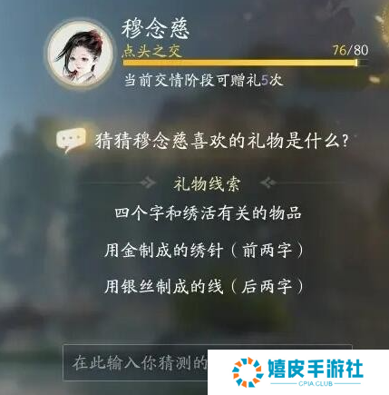 礼物线索三:四个字和绣活有关的物品,用金制成的绣针(前两字),用银丝制成的线(后两字)