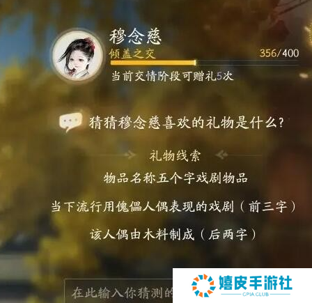 礼物线索六:物品名称五个字戏剧物品,当下流行用傀儡人偶表现的戏剧(前三字),该人偶由木料制成(后两字)